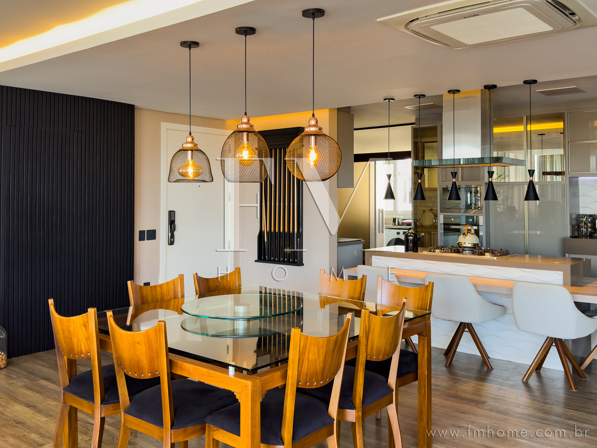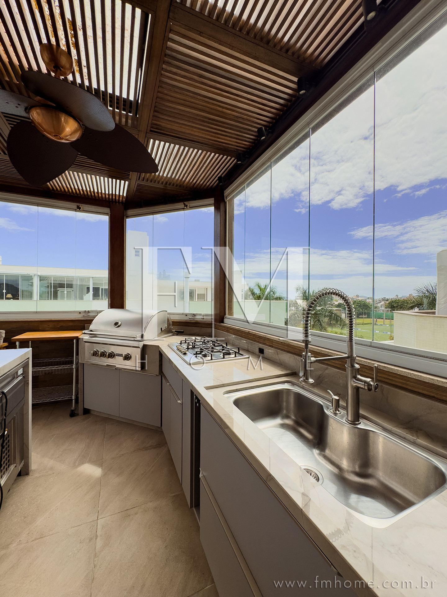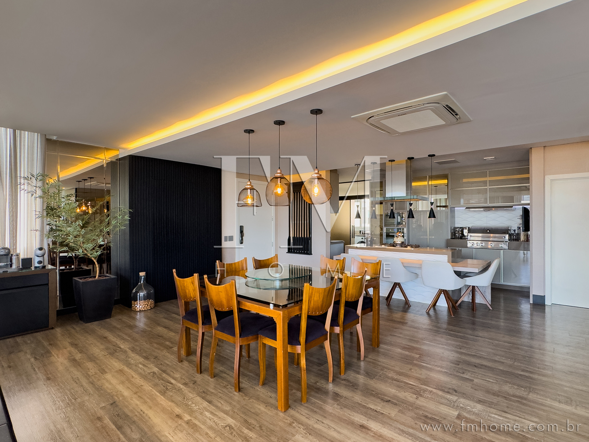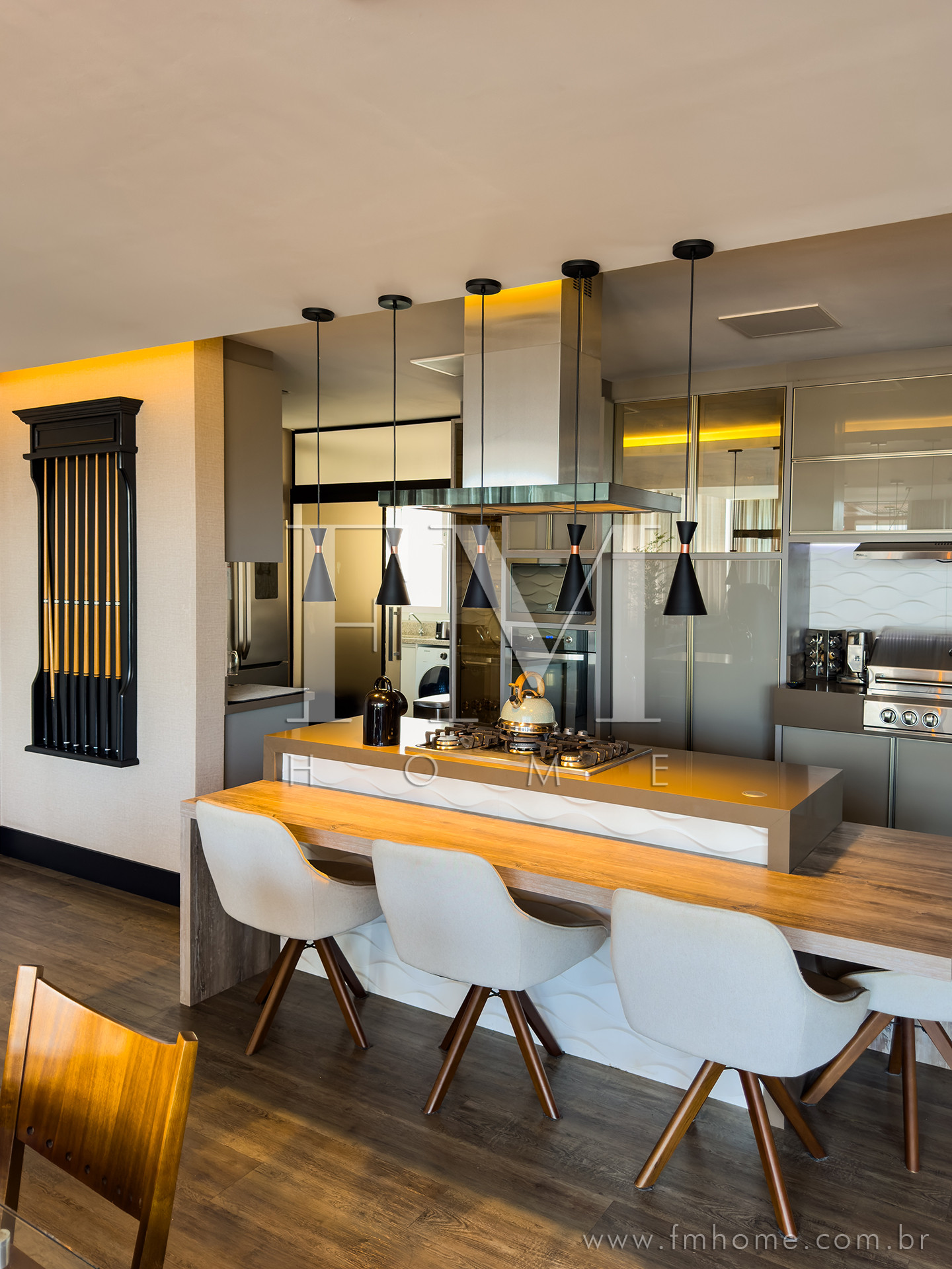 O espaço gourmet, com churrasqueira, integra-se de forma harmoniosa aos amplos ambientes climatizados — um convite para longas conversas, risadas e encontros que ficam na memória.