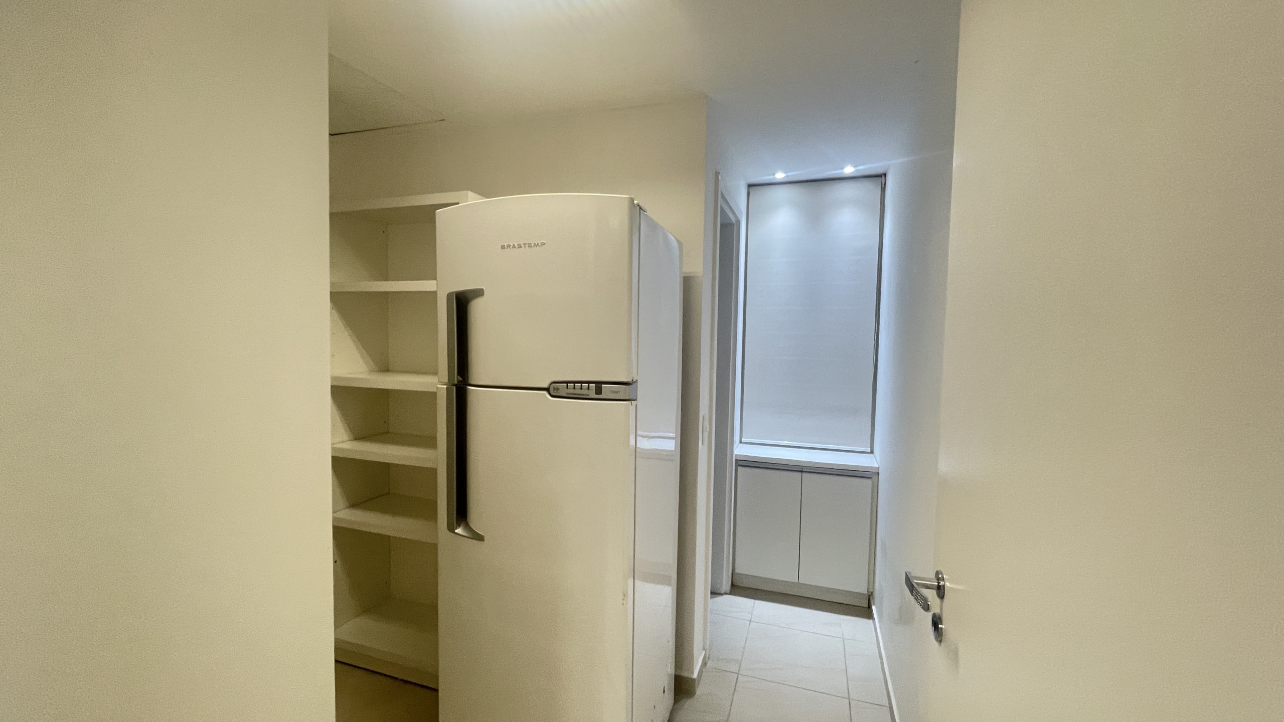 A cozinha, está equipada com geladeira.