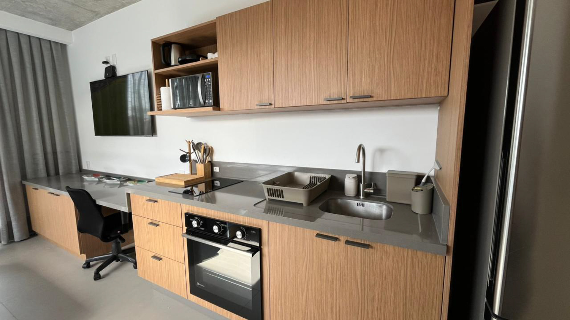 With 35m² very well distributed, the studio is ideal for 2 adults and up to 2 children, combining functionality and comfort. It features a Queen bed and two side bunk beds, air conditioning, Wi-Fi, 55" TV and a comfortable work area.